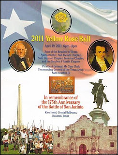 The Yellow Rose Ball was held April 19, 2011, at the Crystal Ballroom of the Rice Hotel in Houston, Texas and was a huge success. The 2011 Yellow Rose Ball was sponsored by the San Jacinto Chapter, the Sam Houston Chapter, the Lone Star Chapter and the Stephen F. Austin Chapter of the Sons of the Republic of Texas. The 2011 Yellow Rose Ball remembered the 175th anniversary of the Texas Revolution and 175th anniversary of the Battle of San Jacinto. Below are some of the pictures taken by Dale Williamson.