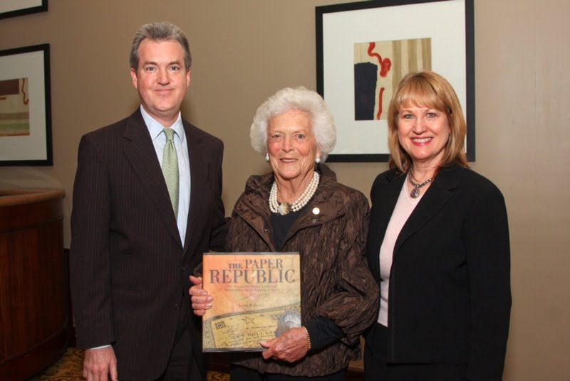 The photo above was taken at an earlier time when Bevill presented a signed copy of The Paper Republic to former First Lady Barbara Bush. Left to right: James P. Bevill, Barbara Bush, and Jodie Bevill.