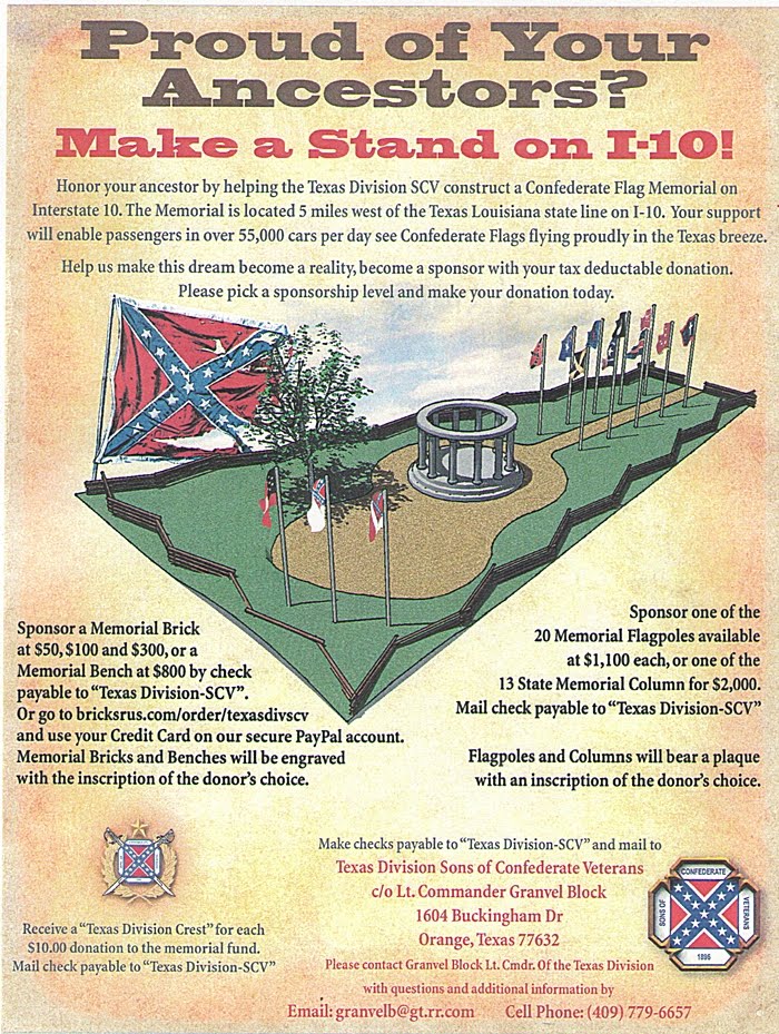 Mail checks payable to “Texas Division-SCV,” and mail to Texas Division Sons of Confederate Veterans, c/o Lt. Commander Granvel Block, 1604 Buckingham Dr., Orange, Texas 77632. For more information, contact Granvel Block Lt. Commander of the Texas Division at granvelb@gt.rr.com