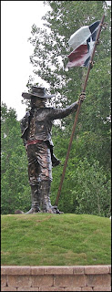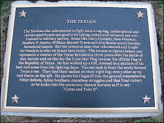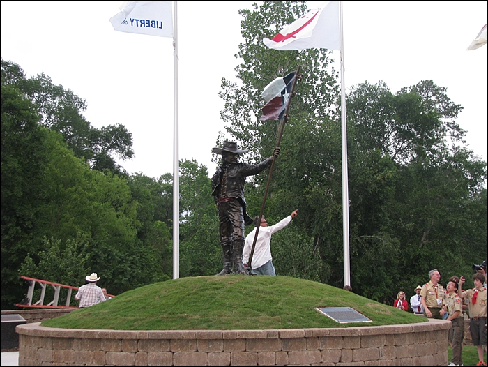 The Texians who volunteered to fight were a rag-tag, undisciplined and opinionated bunch not good with taking orders and certainly not well trained in military tactics. Some like Davy Crockett, Sam Houston, Stephen F. Austin, William Barrett Travis, and Jim Bowie would become household names. But the common man that fought for freedom is who we honor today. The bronze sculpture before you represents a veteran of the Texas Revolution three years after the Battle of San Jacinto and on the day the Lone Star Flag became the official flag of the Republic of Texas. He has walked up a hill, dressed in a mixture of his best and some from his fighting days. The red sash is from the newly formed Texas army. They tied their sashes on the right hip; every other army tied theirs on the left. He plants his flagstaff into the ground remembering bitter defeats, fallen brothers, countless struggles and that final victory as he looks into the uncertain distant horizon as if to say: