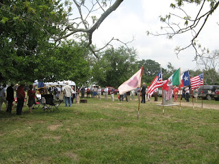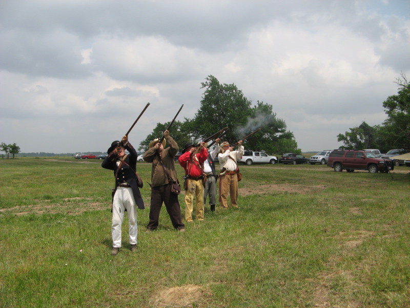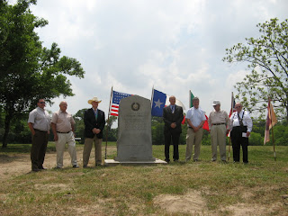 The up-righted, restored and cleaned marker was then unveiled by SRT President General Sam Clark and San Jacinto Chapter President Ron Brown while members of the Sons of the Republic of Texas (David Martin, Tom Houston, Carl Hill, and Dale Williamson) in 1836 period attire fired several black-powder rifle salutes.